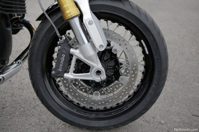 Jos nine T:llä saakin helposti kovan vauhdin aikaiseksi, niin onneksi voi myös todeta jarrupuolen olevan erittäin hyvin kartalla. Etujarruna toimii kaksi 320 mm levyä, ja puristimina on Brembon 4-mäntäiset Monobloc-radialit. Takajarru on 1-levyinen kahdella puristimella, ja kaiken kruunaa lukkiutumaton ABS, joka on vakiona BMW:n kaikissa malleissa.