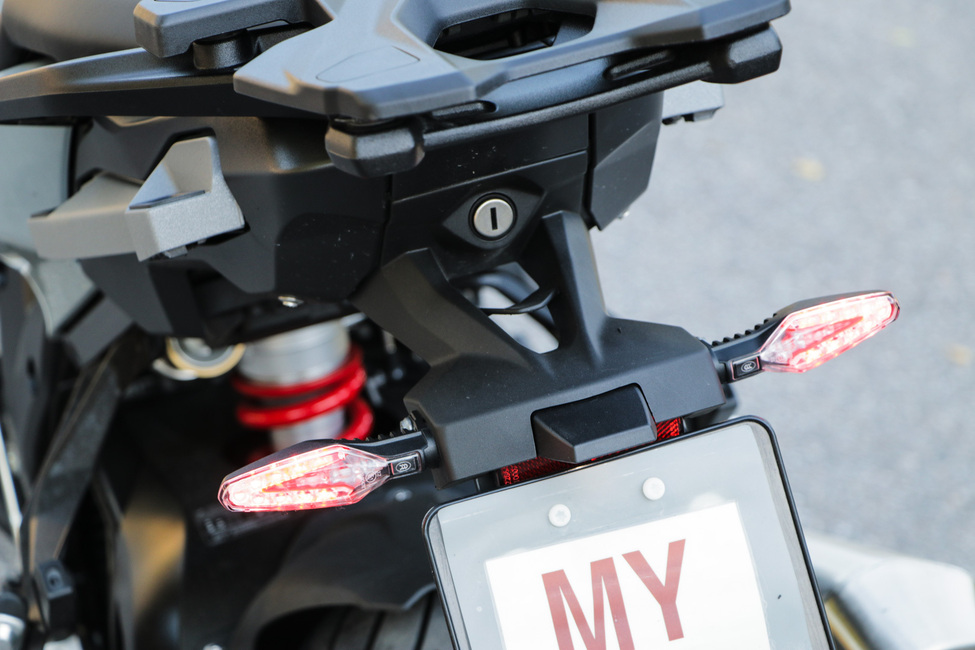 Yksi hienoimmista yksityiskohdista on se, että XR:ssä ei ole lainkaan takavaloa, vaan se on integroitu vilkkuihin. Nuolen muotoiset vilkut ovat näyttävät ja toimivat siis vilkkujen lisäksi takavalona.