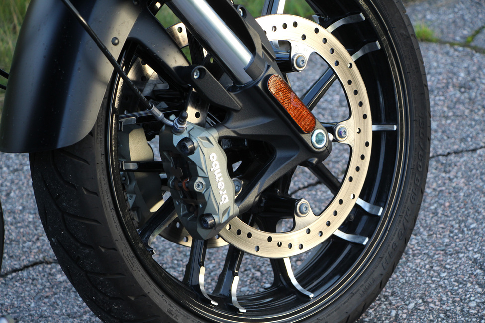Muutokset näyttävät paperilla pieniltä, mutta käytännössä vaikuttavat ajotuntumaan ja -ominaisuuksiin selvästi. Joustomatkaa alustasta löytyy cruiseriksi paljon, edessä 130 milliä ja takanakin peräti 100 milliä. Pidempi joustomatka ja jämäkämpi alusta tekevät pelkkää hyvää kaarreajoa silmällä pitäen ja varsinkin cruiser-pyörän lähtökohtaisesti melko rajallisille kallistusvaroille. Sport Chiefin kallistusvarat ovatkin muutosten myötä piirun verran suuremmat kuin aiemmin, tarkalleen ottaen 29,5 astetta.