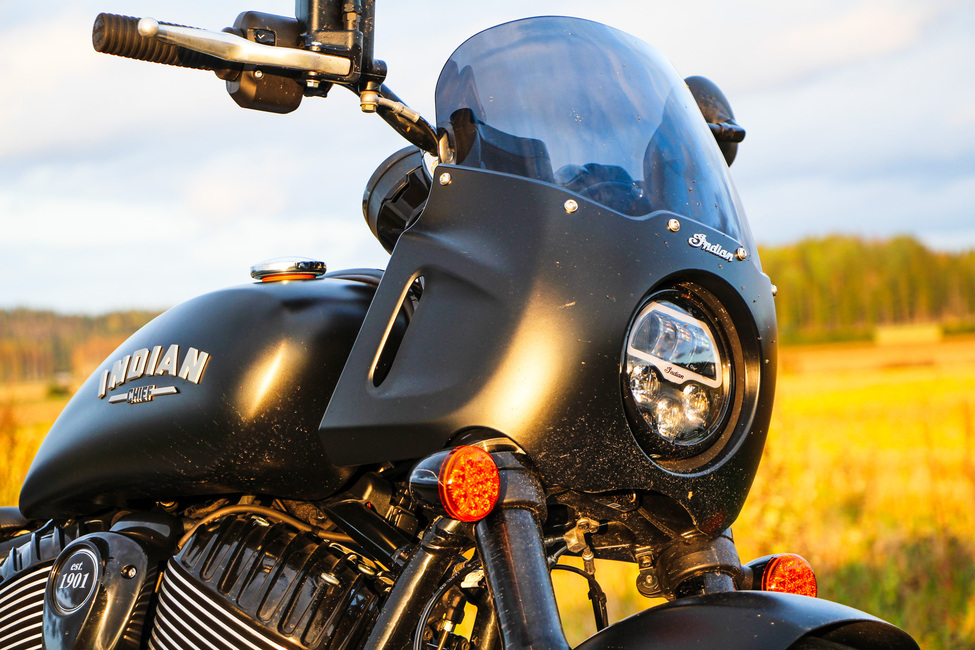 100-vuotisen historiansa kunniaksi muutama vuosi sitten esitelty uuden sukupolven Indian Chief on muhkea cruiser, jonka valttina on perinteisesti ollut kolossaalisen moottorin juureva vääntö ja letkeä ajotunnelma. Heti alkuun mallisto käsitti kolme eri versiota, perusmalli Chief Dark Horse, 16” eturenkaalla ja korkeammalla stongalla varustettu Bobber Dark Horse sekä laukuilla, astinlaudoilla ja tuulilasilla höystetty hitusen matkaisampi Super Chief.