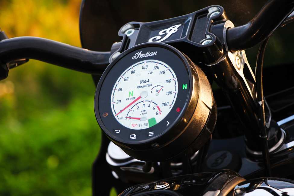 Järkälemäisen twinin käynnistys säväyttää, varsinkin kun koeajopyörään oli vaihdettu avarammat vaimentimet. Äänimaailma on V-Performancen pöntöillä Sport Chiefiin juuri parahultainen. Meteliä ei synny liikaa, mutta kuitenkin sen verran että iso twini tekee itsensä selvästi tiettäväksi lähitienoolle. Ajomoodeja löytyy kolme, Standard, Tour ja Sport ja asetuksien hallinta tapahtuu joko ohjaustangon nappuloista tai vaihtoehtoisesti mittaristona toimivan pyöreän 4” kosketusnäytön kautta.