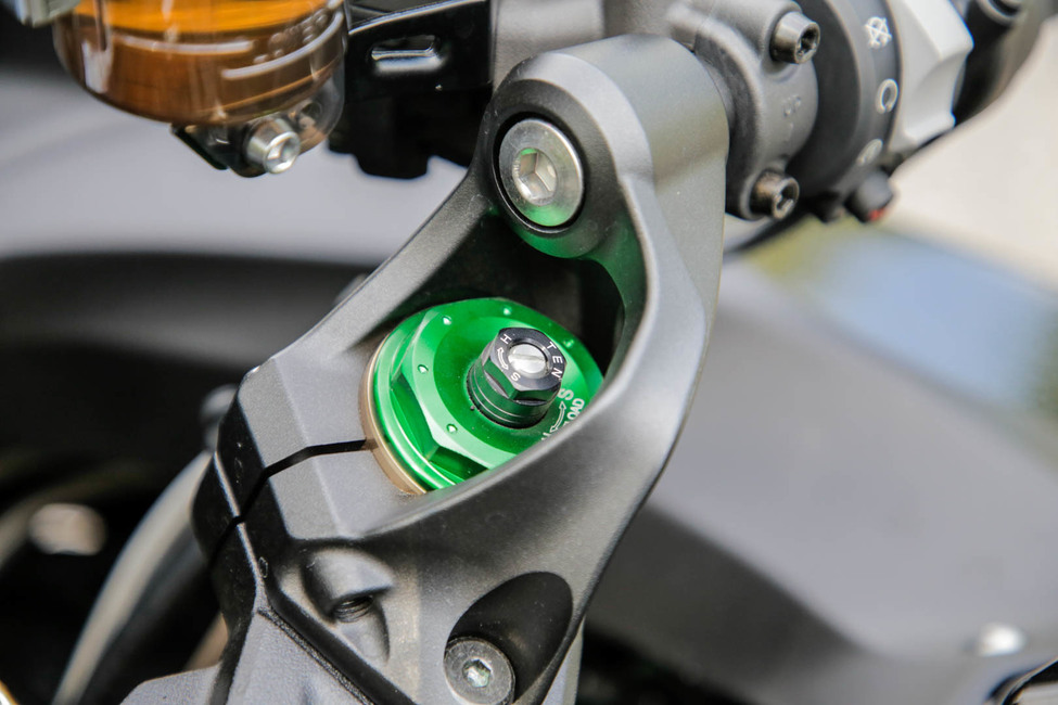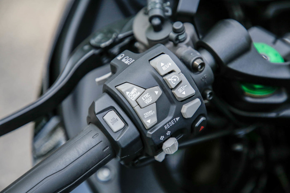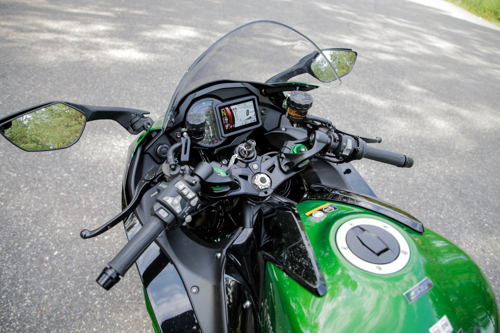 Kawasakin elektroniikkaa pystyy säätämään laajasti ja räpellettävää todella riittää. Osa toiminnoista vaikuttavat hieman turhilta, mutta on toki kivaa, että pyörän saa säätää juuri mieleisekseen. Sama pätee myös ajoasentoon, jota voi säätää ohjaustankoa ja jalkatappeja liikuttamalla. Se on kätevää erityisesti silloin kun ajoasentoa muutetaan vaikkapa rata- ja matka-ajon välillä.