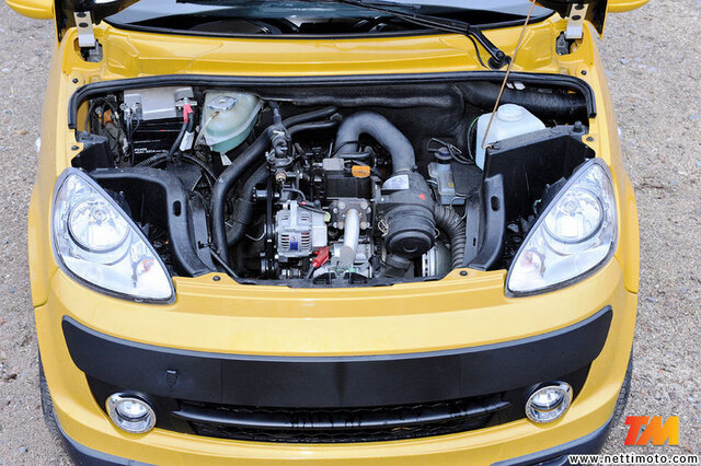 Microcar on etuvetoinen, ja siinä on kaksisylinterinen dieselmoottori. Runko on tehty alumiinipalkista.