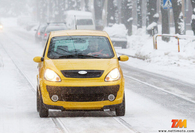 Mopoauto hankittiin toimitukseen juuri talven kynnyksellä. Laki ei vaadi käytettäväksi mopoautossa talvirenkaita. Riittää, että renkaat ovat tarpeeksi karkeakuvioiset ja niissä on kulutuspintaa yksi millimetri. Henkilöautoja suurpiirteisempää talvirengasasetusta voidaan pitää lainsäätäjän kannalta lipsahduksena.