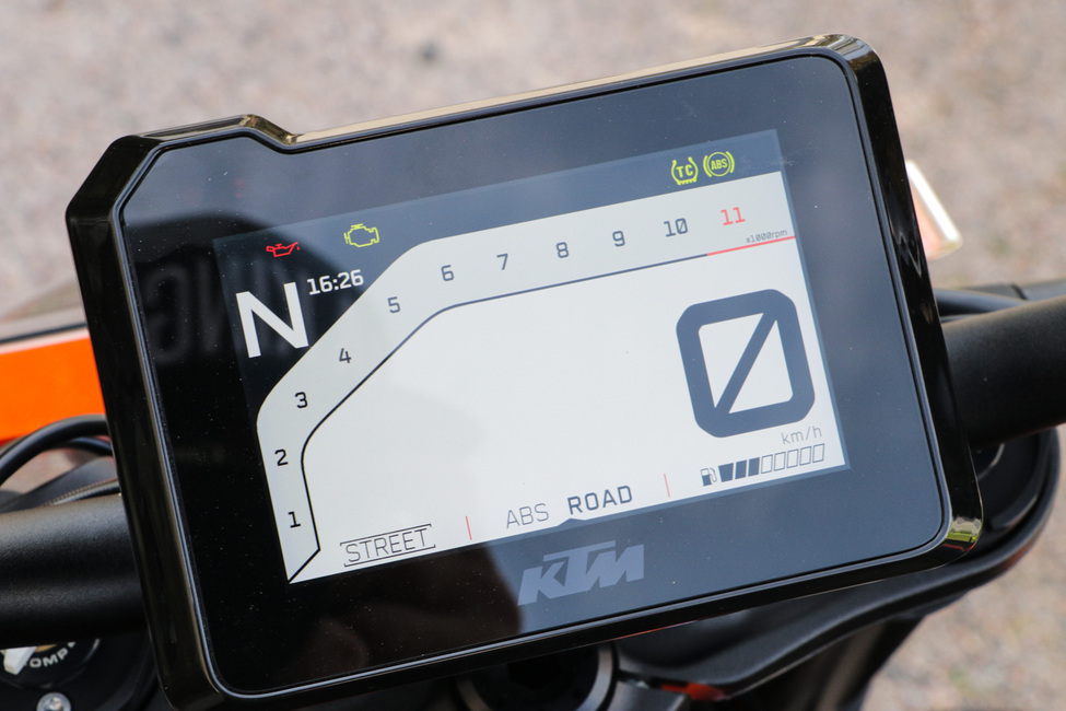 SuperDuke edustaa elektroniikaltaan prätkämaailman huippua, sillä elektroniikkapaketista löytyy luistonesto, keulimisenesto, kaarre- ja supermoto-ABS:t, molempiin suuntiin toimiva shifteri, vakionopeudensäädin ja säädettävät ajotilat. Lisäksi sen voi parittaa yhteen älypuhelimen kanssa.