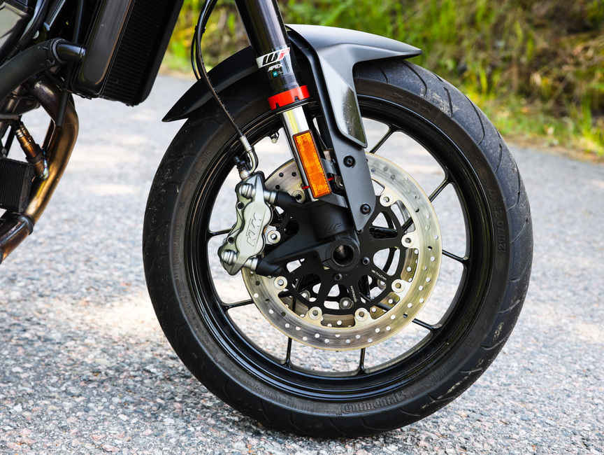 Täysin säätövapaa keula kuulostaa nykypäivänä hieman kyseenalaiselta, mutta KTM on onnistunut tekemään siitä todella yleispätevän. Keula painuu toki alas kovemmissa jarrutuksissa, mutta katuajossa se ei pääse häiritsemään. Sama pätee takajousitukseen, joka on peruskäyttöön aivan riittävä.