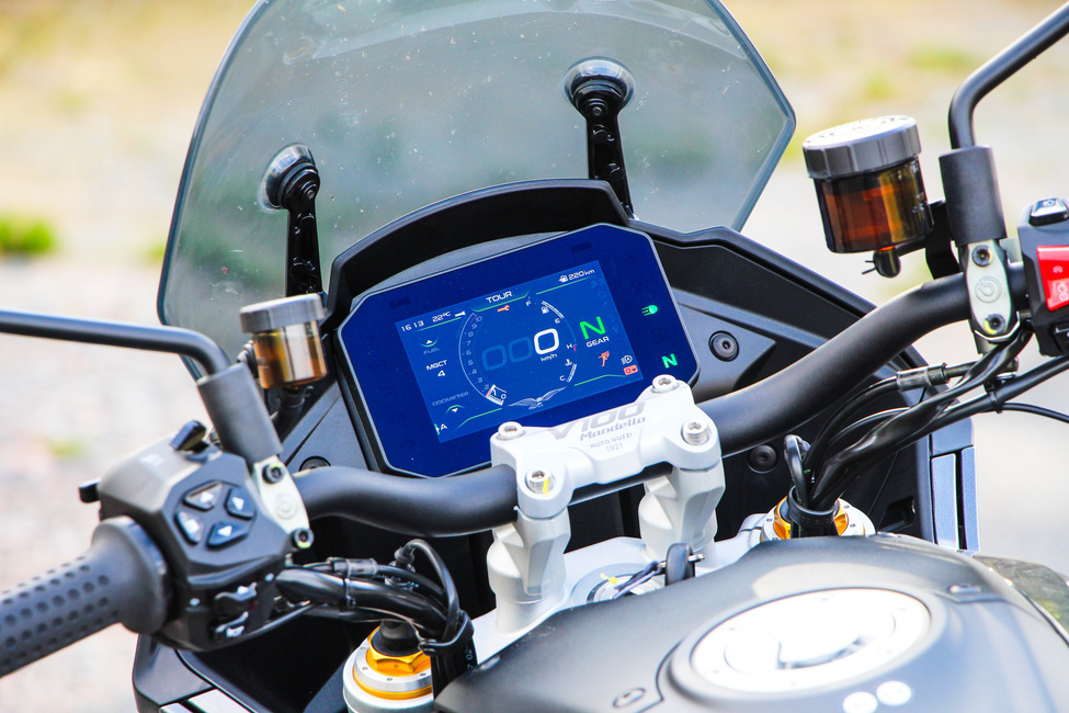 Vaihteenvaihdon hetkellä tunnelma hieman latistuu, sillä ainakaan koeajopyörässä quickshifterin toiminta ei vakuuttanut. Vaihdeavustin toimi kaikkinensa hyvin epämääräisesti ja vaihde vaihtui, jos vaihtui, melkoisen loikan saattelemana. Myös alaspäin vaihtaessa pykälän kytkeytyminen oli nahkeaa, joten Guzzin sinänsä kylläkin tunnokas kytkin oli ahkerassa käytössä vaihteita vaihdellessa. Lopulta kyseessä lienee kuitenkin ohjelmistopäivityksellä korjattavissa oleva vika, joten jatkossa shifterin toiminta on todennäköisesti sujuvampaa.