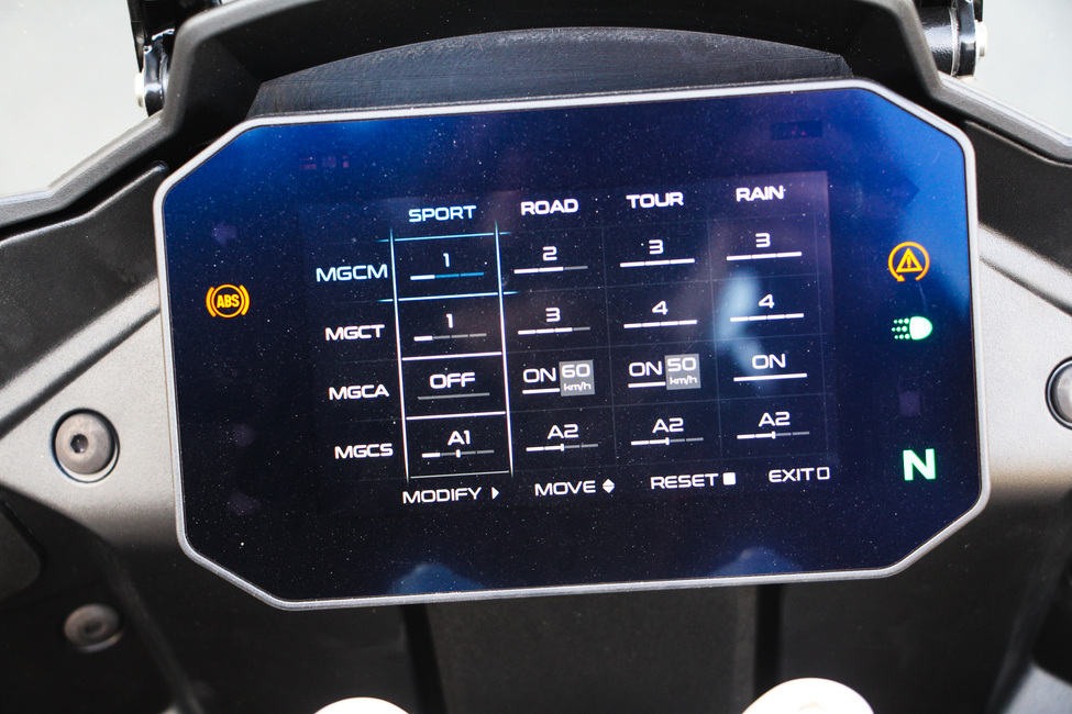 Dynamic-asetuksella alusta on erittäin jämäkkä ja mutkien loiventuessa tulee melko nopeasti vaihtaneeksi takaisin Comfortille jolloin meno on huomattavasti pehmeämpää. Asetusten muutokset on helppo toteuttaa loogisesti toimivan käyttöliittymän kautta ohjaustangon vasemmanpuoleisesta kahvasta. Ajomoodeja on tarjolla neljä, (Sport, Road, Tour ja Rain) joista jokaisen voi räätälöidä monipuolisesti mieleisekseen moottorikarttojen, luistoneston ja jousitusasetuksienkin osalta.