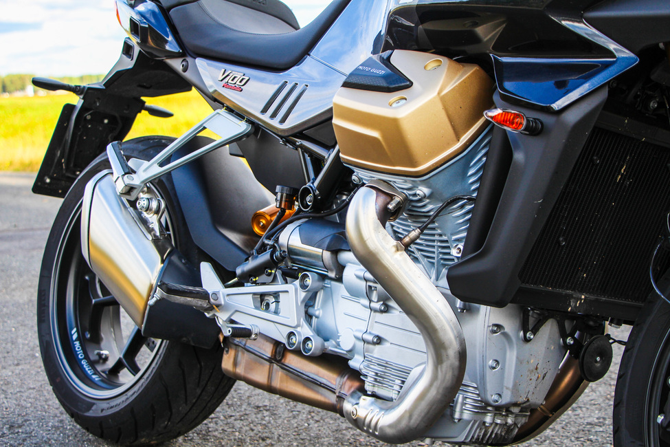 Käynnistysnapin painallus herättää jykevän twinin henkiin ja Mandello heilahtaa vienosti sivusuunnassa. Moto Guzzin koneiden ominaisuus, pitkittäisen kampiakselin aiheuttama sivuttaisheilahdus kaasua avatessa on uudessa moottorissa saatu vaimennettua erittäin hyvin. Ilmiö on toki havaittavissa terävämmin kaasutellessa, mutta häiriöksi siitä ei ole.