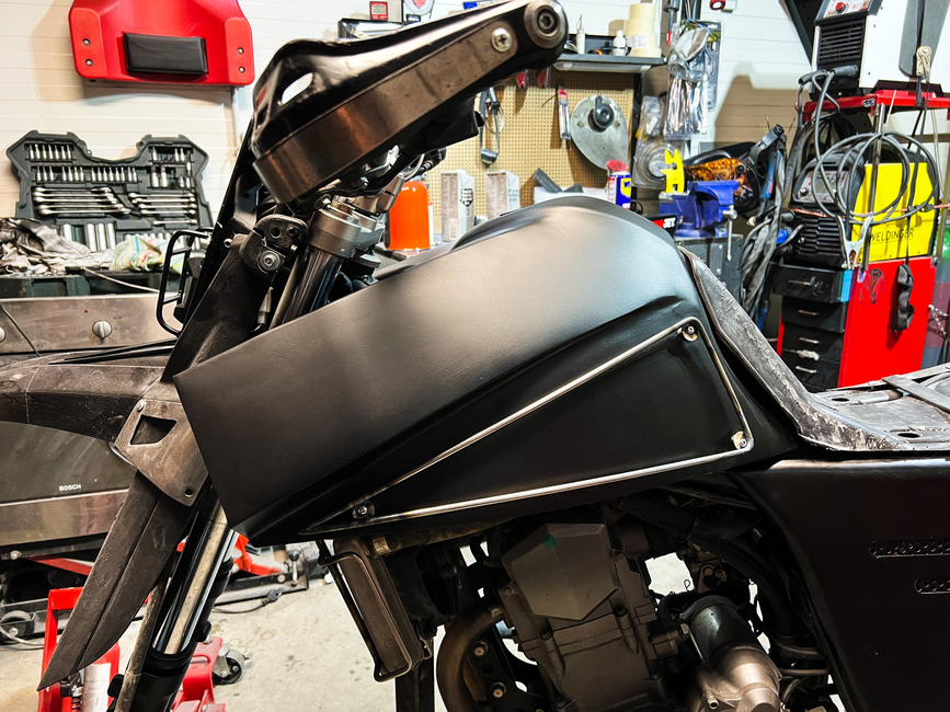 Leveä tankki vaatii leveät raudat, jotta metallista “muovattu” polttonestesäiliö ei pääse vaurioitumaan kaatumistilanteessa.