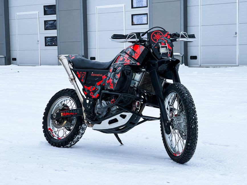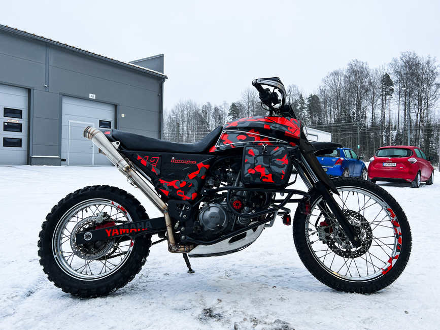 Parin vuorokauden viimeistelyn jälkeen Yamaha XT660R on vihdoin valmis paljastettavaksi. Olen suoraan sanoen hieman järkyttynyt, mutta positiivisella tavalla. Mattamusta pyörä on muuttunut teippauksen ansiosta räikeäksi ja entistä enemmän massasta erottuvaksi.