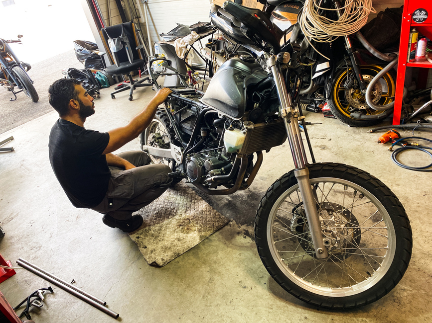 Moottoripyörän rakentaminen alkaa luonnollisesti siitä, että pyörä riisutaan nykykuosistaan, jotta päästään näkemään millaisia mahdollisuuksia muovin ja nykyisen kuosin sisälle kätkeytyy. Niin tapahtui myös XT:n kohdalla, joka riivittiin alastomaksi tunnin huhkimisen jälkeen.