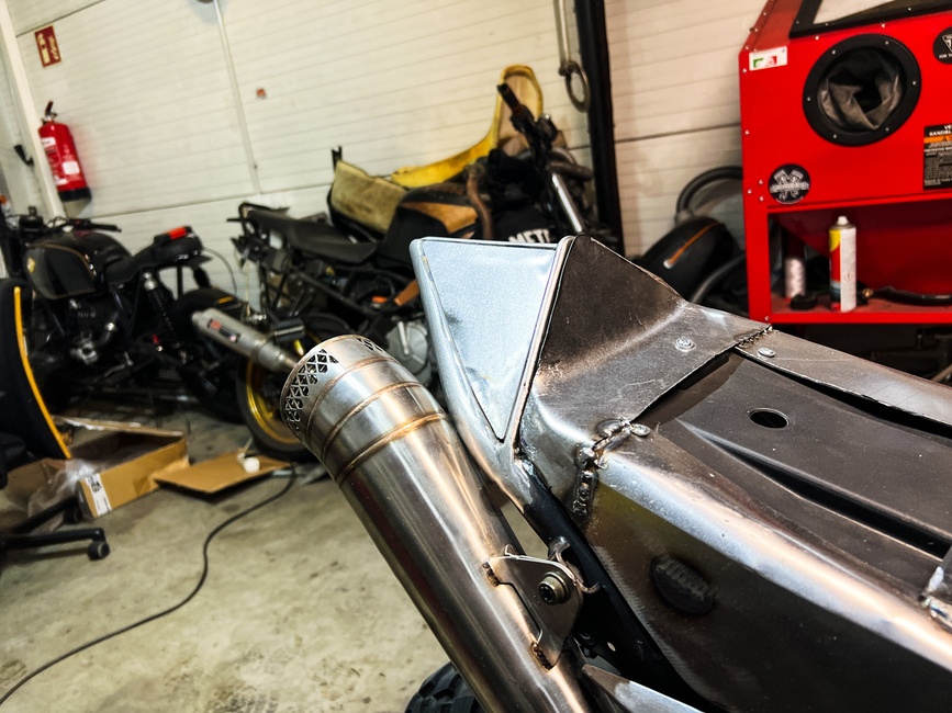 Pyörän ilme muuttuu riisumalla ja uudella tankilla totaalisesti. Tankin muodostumista on myös kiehtovaa katsella, sillä toden totta Hamdan ei käytä havainnepiirrustuksia, pahvimuotteja tai muutakaan. Kaikki syntyy paikan päällä metallista.