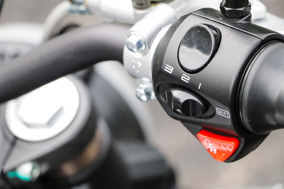Ja prätkään tottuneelle jarruttaminen vaatii pienen ajatustavan muutoksenkin. Kaasukäden jarrukahva vaikuttaa kuten normaalistikin etupyörään, mutta vasemman käden kahva onkin kytkimen sijaan yhdistelmäjarru, joka operoi molempien pyörien jarruja.