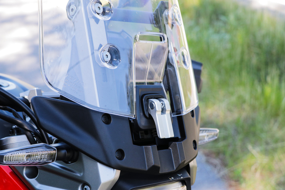 Pleksin säätö on hyvä asia, mutta vivun olisi kyllä voinut sijoittaa tuulilasin toiselle puolelle. Tällaisenaan siihen on vaikea yltää ajon aikana, minkä vuoksi pyörä joutuu pysäyttämään säädön ajaksi.