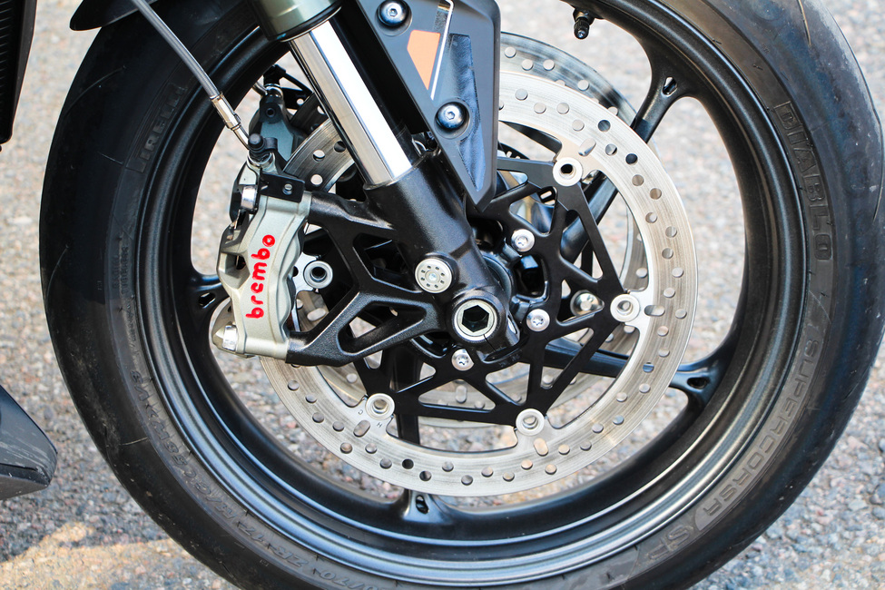 Brembon Stylema-jarrut toimivat maineensa veroisesti ja tarjoavat uskomattoman paljon pysäytysvoimaa sekä erinomaisen kahvatuntuman. Normaalissa ajossa yksi sormi kahvalla riittää tehokkaaseen pysähtymiseen ja jarruvoiman annostelu on helppoa ja tarkkaa. Radallakin kahden sormen puristus kahvasta riittää hyvin taltuttamaan vauhdin kovistakin lukemista.