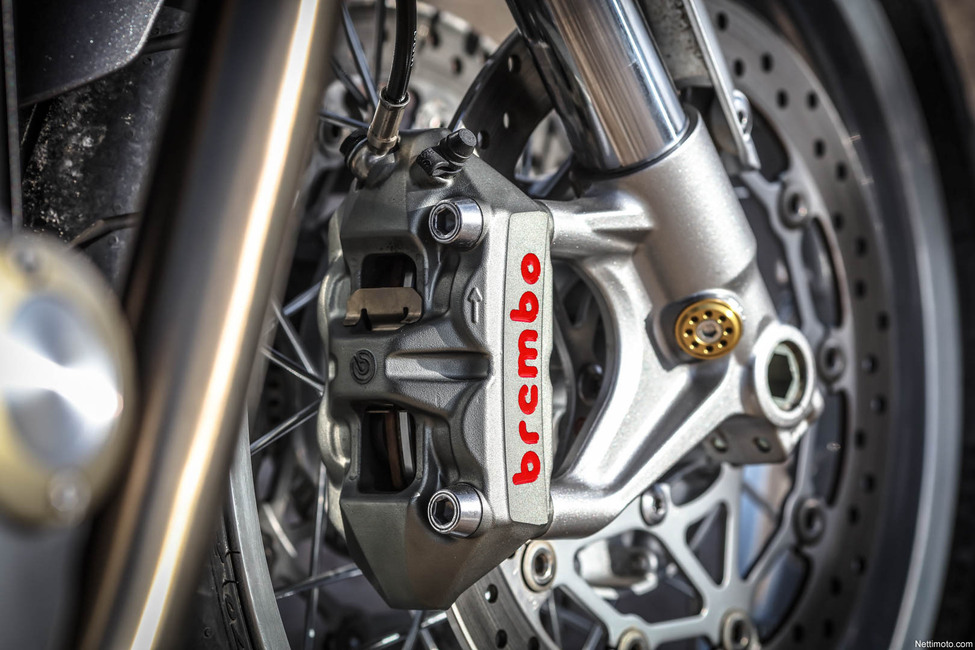 Brembon nelimäntäiset radiaalijarrut ovat nykypäivänä yleinen jarruvalinta sporttipyörään. Toki niitäkin on eri versioita ja jarrujen teho vaihtelee myös pääsylinterin ja jarrulevyjen mukaan. Thruxtonin jarrujen erinomaisuus tulee esille, kun koeajossa laskedutaan alas Portugalin korkeimman vuoren Serra de Estrelan rinteitä. Viime tinkaan jätetty jarrutus alamäessä ei saa kunnolla edes pulssia nousemaan, niin helposti Thruxton mutkiin hidastuu, vaikka suorilla innostuu kaasua availemaan ja vauhti kasvaa tarkoitettua suuremmaksi.