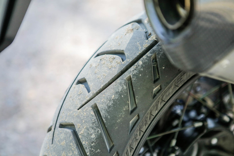 Myös ajoasento hakee ainakin 183-senttisellä kuskilla paikkaansa. Ohjaustangon ja istuimen väli on pidempi kuin monessa muussa adventuressa ja kuski joutuu istumaan kassit kiinni bensatankissa. Parin sentin muutos stongan paikkaan tekisi varmasti hyvää, mutta näillä mennään.
