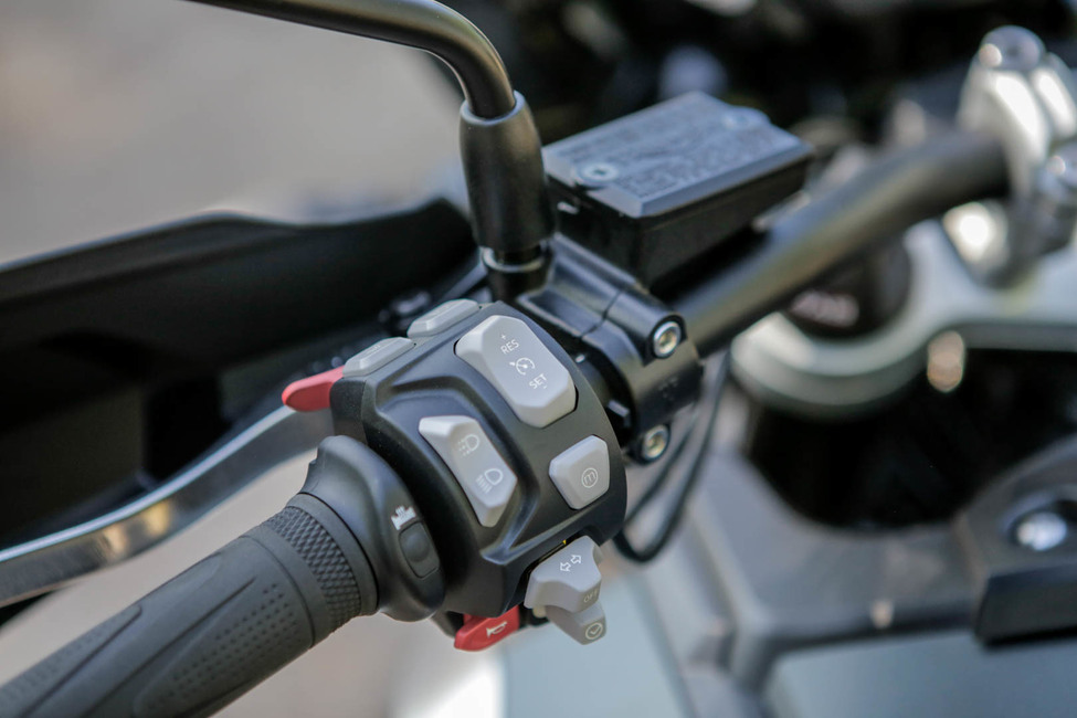 Myös pleksin säätö yllättää positiivisesti. Se säätyy sähköllä ja toimii kuin ajatus. Lisäksi yläasennossa se poistaa kaiken ajoviiman kypärästä, mikä mahdollistaa ajamisen visiiri auki pitkästi yli satasen vauhdeissa. Huminakaan ei pääse häiritsemään. Se nostaa ajomukavuuden seuraavalle tasolle.