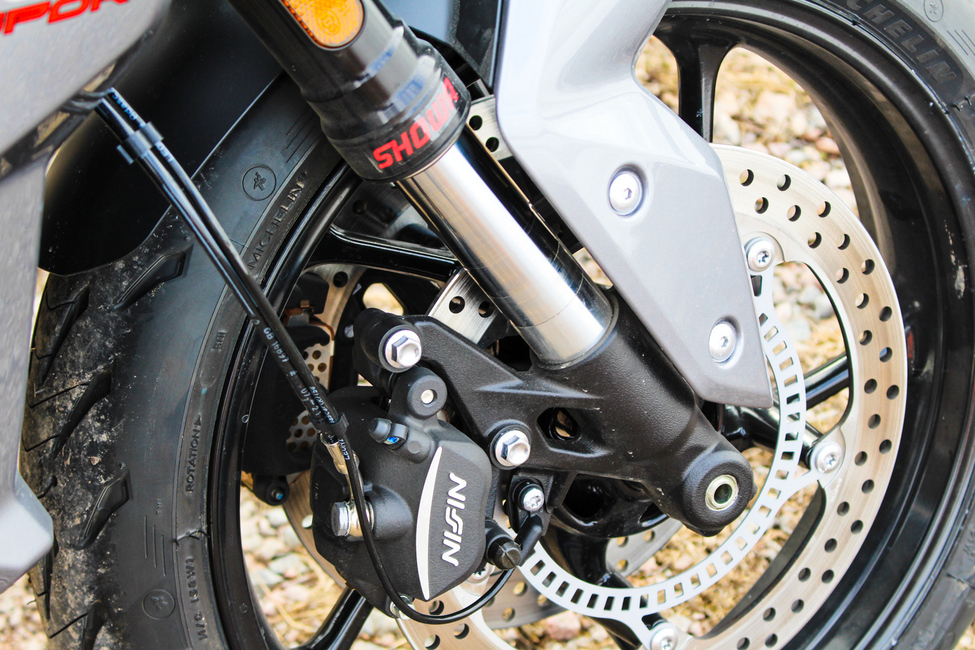 Tigerin jarrut ovat niin ikään peruskauraa. Kahden 310-millisen etulevyn voimin pyörä pysähtyy hyvin, tosin pienin varauksin. Jarrut tuntuvat tehokkailta ja pari sormea kahvalla riittää tiukempaankin jarrutukseen. Takajarru taas tuntuu äkkiseltään jopa liian tehokkaalta. Hiukankin kovempi painallus pyrkii välittömästi lukitsemaan pyörän, jolloin ABS puuttuu peliin ja päästää jarrupainetta karkuun, mikä taas osaltaan pidentää jarrutusmatkaa.