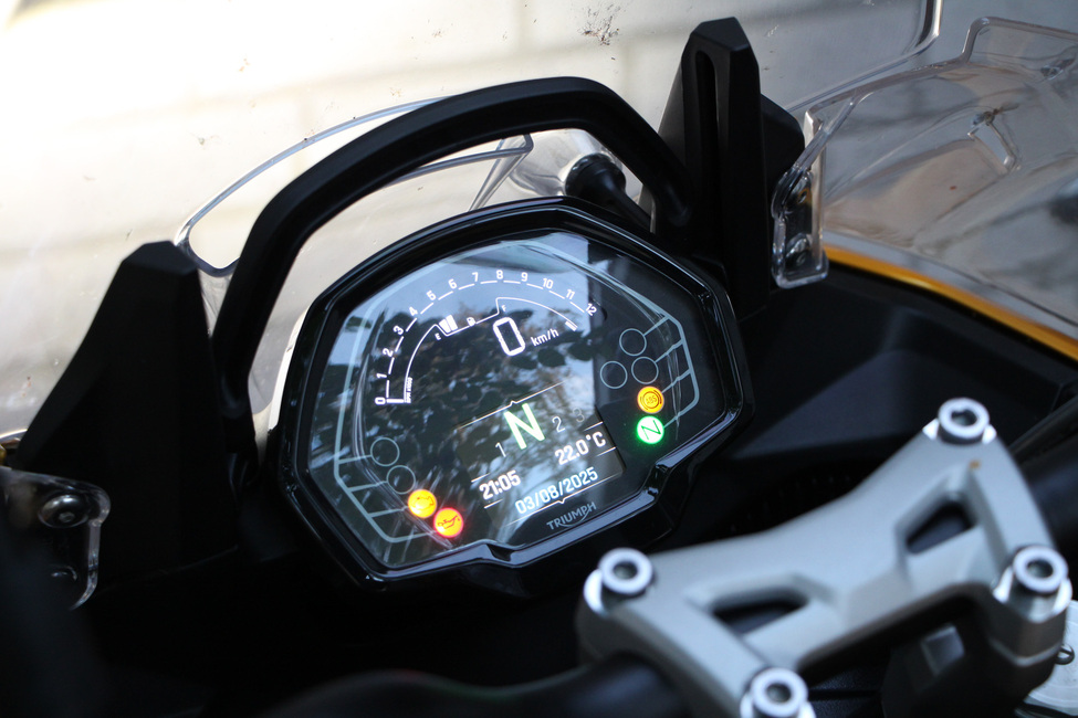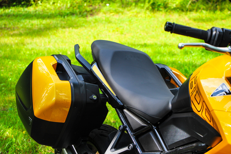 Satula on myös mukavan puoleinen mikä matkapyörässä on tietysti suotavaakin. Tuhto on etuosastaan kapea, joten jalat ylettää maahan hyvin lyhyemmältäkin kuskilta ja leveämpi takaosa tarjoaa sopivasti tukea ahterille. Ainoa selkeä miinus tulee mittaristosta, joka vaikuttaa nykymittapuulla melkoisen vanhahtavalta, eikä sovi Tiger Sportin moderniin olemukseen. Näytön luettavuus on heikkoa ja kirkkaassa auringonpaisteessa lasi heijastelee siinä määrin että nopeutta tai kierroslukua voi lähinnä vain arvailla.