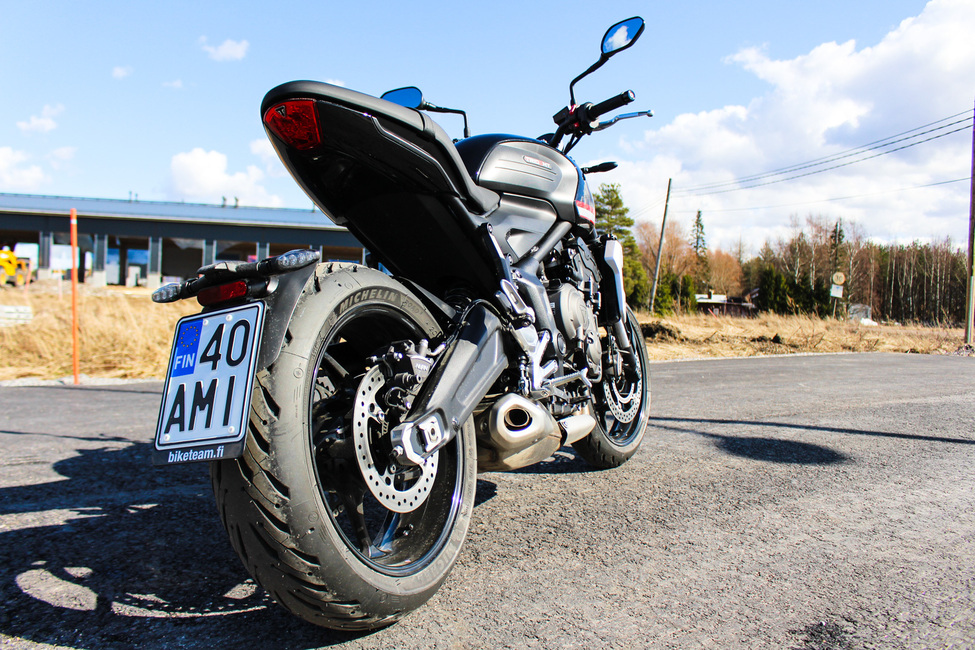 Vertailun vuoksi, pahimmista kilpailijoista Yamaha MT-07 luovuttaa tehoa 73 hevosvoimaa ja Kawasaki Z 650 puolestaan 68 heppaa. Tehokilvassa Trumppa siis vetää selkeästi pidemmän korren.