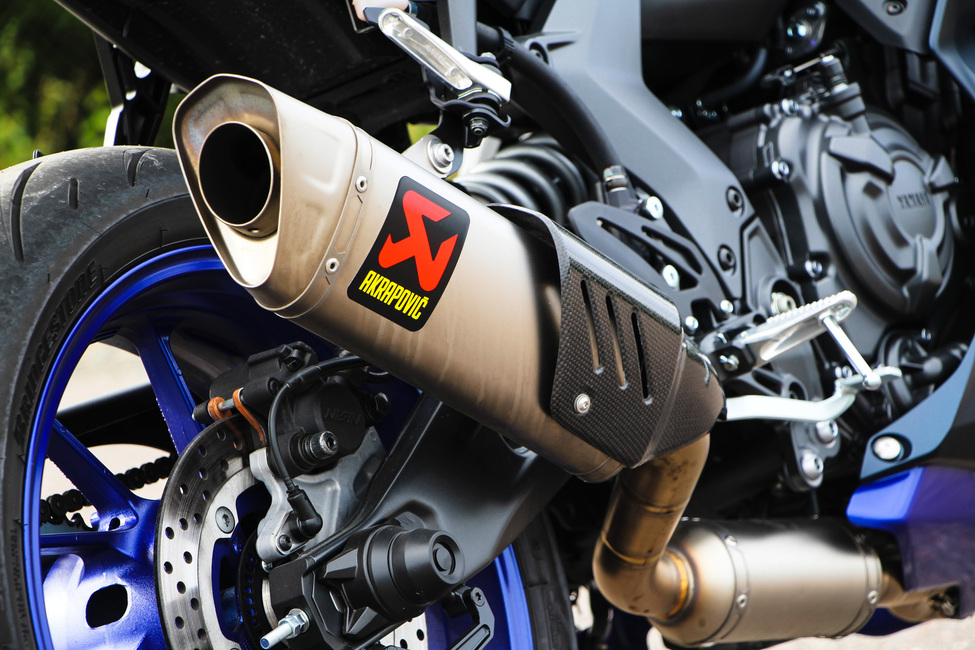 Tehoa rivikakkosesta irtoaa 73 virkeää hevosvoimaa. Koeajopyörään oli vaihdettu Yamaha Centerin toimesta Akrapovicin kokoputkisto, joka parantuneen vedon lisäksi tarjoaa myös selvästi aiempaa rouheamman käyntiäänen. Soundi ei ole liian voimakas mutta tuo sopivasti bassoa crossplane-koneen omintakeiseen käyntiin. R7:aan on tarjolla paljon erilaisia lisävarusteita somisteista laukkuihin ja race-palikoihin.