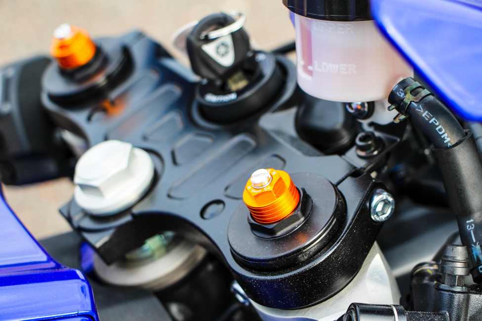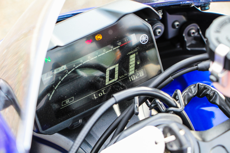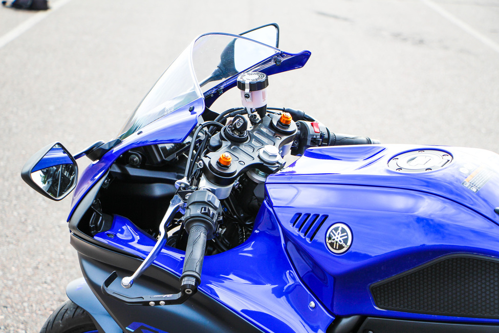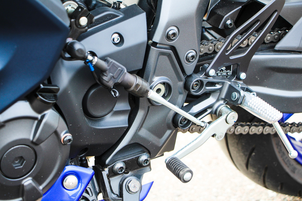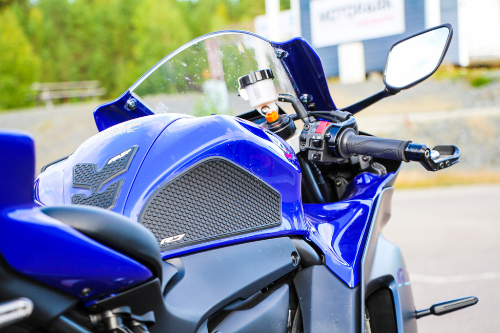 Yksi tärkeimmistä lisukkeista oli niin ikään asennettu koeajopyörään. Quickshifter-vaihdeavustin mahdollistaa ylöspäin vaihdot ilman kytkintä ja vaikka sen parhaat ominaisuudet tulevatkin paremmin esiin nopeassa ajossa, tekee se arkiajostakin sulavampaa. Reilun parinsadan hintaisena ehdottomasti hankinnan arvoinen varuste. Sporttisuudesta huolimatta R7:n alusta toimii hyvin ihan normiajossakin. Keulasta löytyvät kaikki säätömahdollisuudet ja takajousesta esijännityksen ja paluuvaimennuksen säädöt.