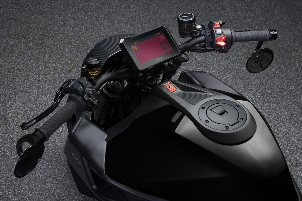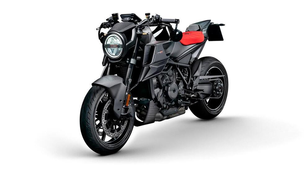 Samalla KTM:n muotokieli ottaa askeleen kohti Ducati Diavelin vastaavaa. Tankin alle tuodut ilmanottoscoopit näyttävät siltä, että ne on napattu italialaistehtaan mörköpyörästä. Toisaalta inspiraation lähteeksi valikoitunut pyörä ei ole huono vaihtoehto.