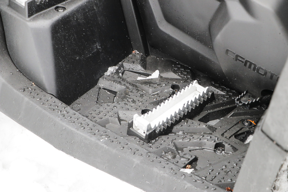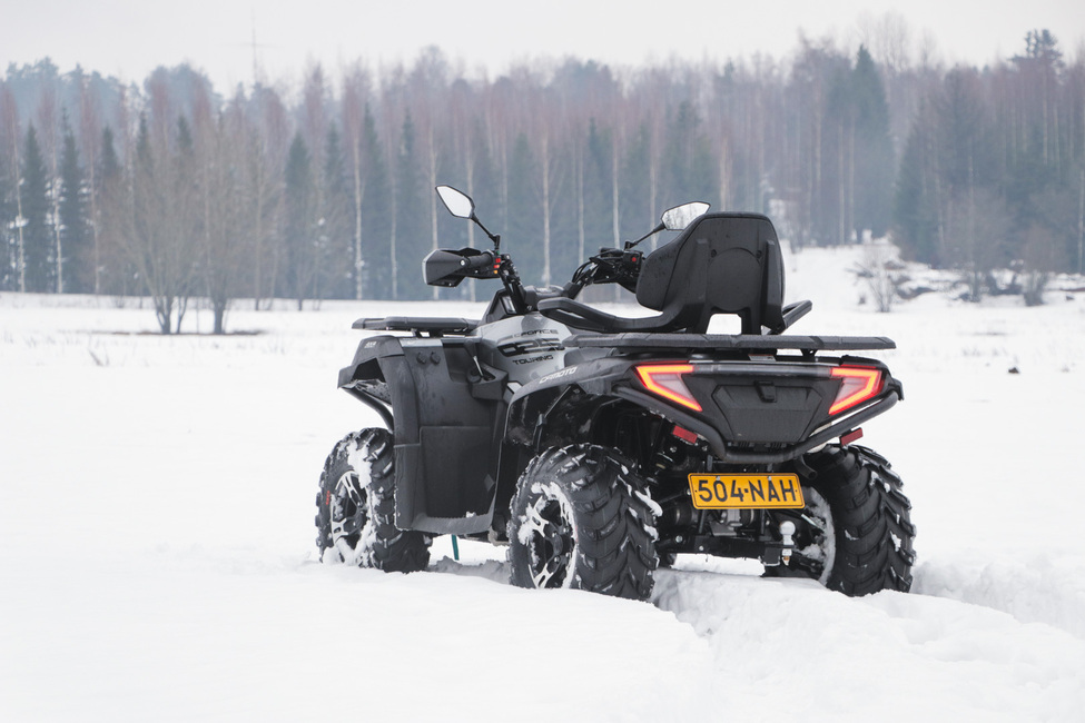 Tieliikenteessä laite on kuin kotonaan. Pidemmän akselivälin rauhoittama käytös on todella tehnyt hyvää kokonaisuudella ja kaksi päälläkin CF Moto kulkee kuin unelma, vaikka koeajon aikana tiellä olikin melko reippaasti loskaa ja lunta.
