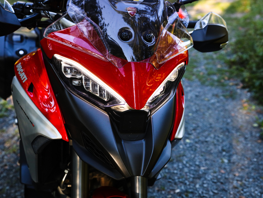 Moottoritieajo on Multistradalla poikkeuksellisen mieluisaa. Uudelleen muotoiltu pleksi ohjaa ilmavirran sivuun hämmästyttävän hyvin, eikä aiheuta juurikaan kypärämelua alimmassakaan asennossa, ainakaan pienikokoisemmalle kuskille. Visiiri auki ajaminen tuntuu luontevalta vielä 120 km/h vauhdissa ja pidemmällä matkalla voi keskittyä maisemien katseluun jatkuvaa tuulta vastaan taistelemisen sijaan. Pleksi on helposti yhdellä kädellä säädettävä eikä sähkösäätöä jää kaipaamaan.