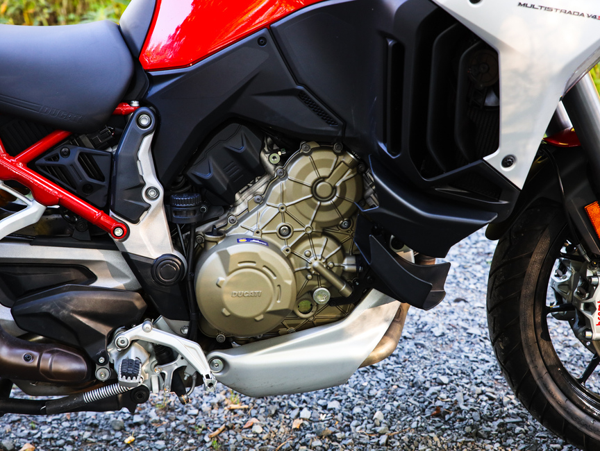 Moottori perustuu pohjimmiltaan Panigalen koneeseen, mutta Multistradaa varten mm. iskutilavuutta on kasvatettu ja käytöstä muokattu adventureen paremmin soveltuvaksi. Seikkailulla ei V4:n huolloistakaan tarvitse liikoja paineita ottaa. Uuden pannun öljynvaihtoväli on 15 000 km ja venttiilien tarkistusväliksi ilmoitetaan peräti 60 000 kilometriä. Entisaikojen Ducatien painajaismaisen tiheät huoltovälit ovat siis Multistradan kohdalla jääneet historiaan.