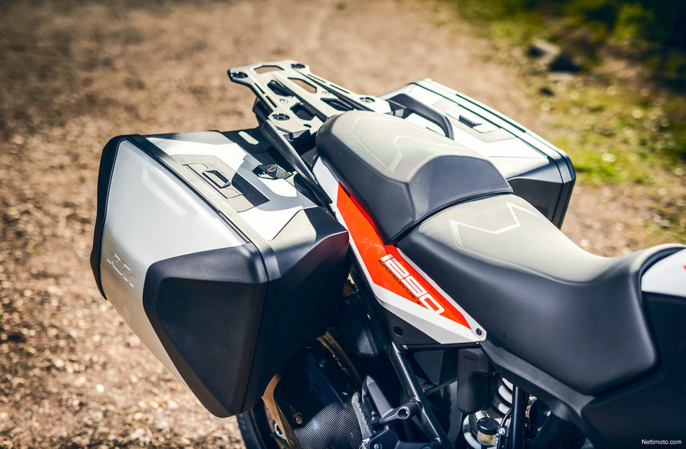 Moottoritiellä havaitsee mittaristossa makean yksityiskohdan; nopeuden kasvaessa myös nopeuslukeman fonttikoko kasvaa helpottaen luettavuutta. Mittariston taustaväri muuttuu nopeasti ”yönäyttötilaan”, kun ajaa tunneliin sisään. Vaihtovalona puolestaan toimii koko mittaristo, sillä taustaväri muuttuu punaiseksi kun KTM kehottaa vaihtamaan isompaan pykälään. Koeajopyörissä on sivulaukkuina KTM:n ”alumiinisalkut”, sillä valmistaja haluaa tarjota mahdollisuuden kokeilla käytännössä miten paljon vakaampi pyörä on nyt kun sivulaukkujen kiinnitys on muutettu ”puolikelluvaksi”. Laukkujen yläosan kiinnike on ”nivel”, ja laukkujen alaosa pääsee liikkumaan sivusuunnassa.