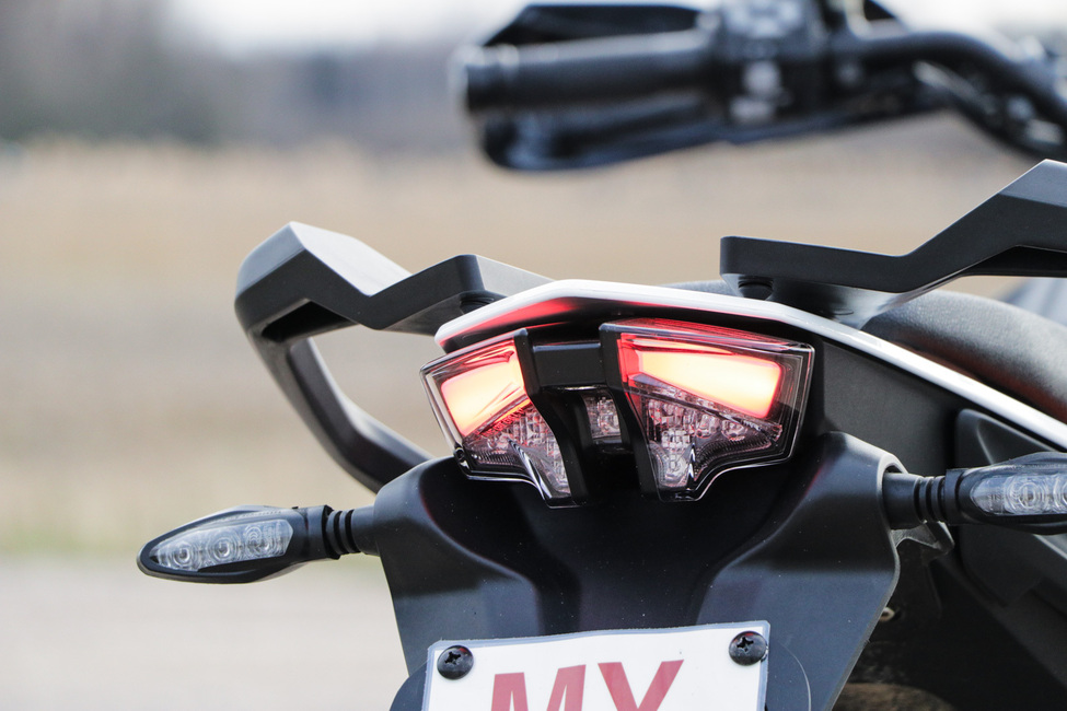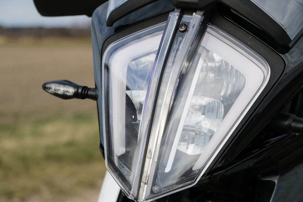 Lisäksi TFT-mittaristo on varsin vakuuttava. Se on sama mitä KTM käyttää kalleimmissa malleissaan. Sama pätee etuvaloon, sillä se on vastaava kuin vaikkapa isoveli 790 Adventuressa. Kaasukin on sähköinen ja kaiken lisäksi pyörästä löytyy luistokytkin ja kaarre-ABS:t. Ei huonommin 8000e maksavalta moottoripyörältä.