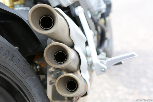 Voimantunne on todellakin uskomaton. Kolme sylinteriä kehittävät tehoreservin, joka ei todellakaan jätä kylmäksi. Lyhyehköt välitykset ja pieni akseliväli tekevät käytöksestä ketterää ja räväkkää, mutta ne aiheuttavat myös sen, että etupyörää on mahdoton pitää asfaltin pinnassa.