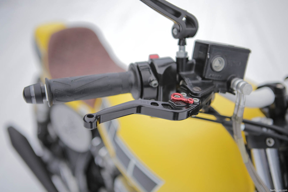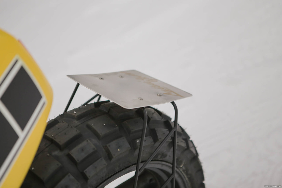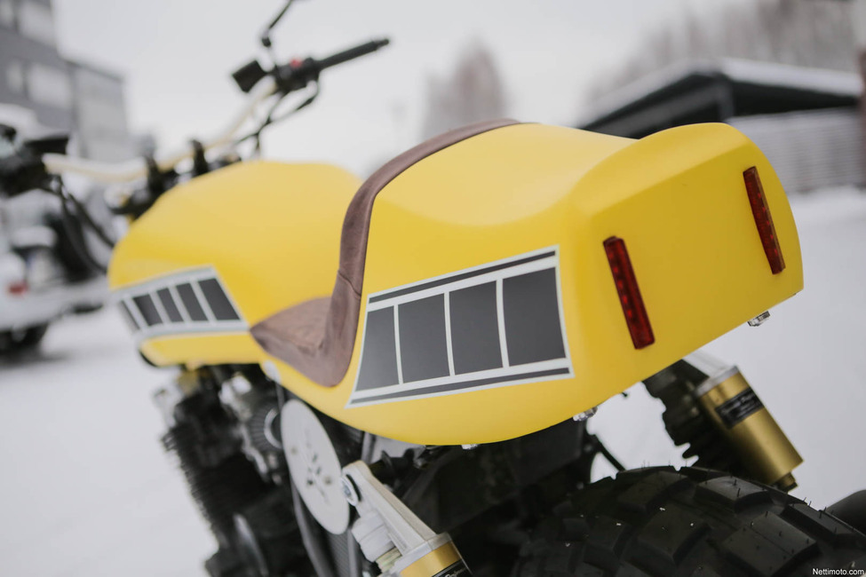 Kelta-musta-valkoinen värimaailma sopii erityisesti takakatteen kanssa hyvin yhteen, sillä pyörän muotokieli tuo vahvasti mieleen esikuvana toimineen Kenny Robertsin aikaiset superpyörät Toki mukana on paljon moderniakin ilmettä, sillä tarkoituksena ei ollut suinkaan rakentaa 70-lukulaista pastissia.