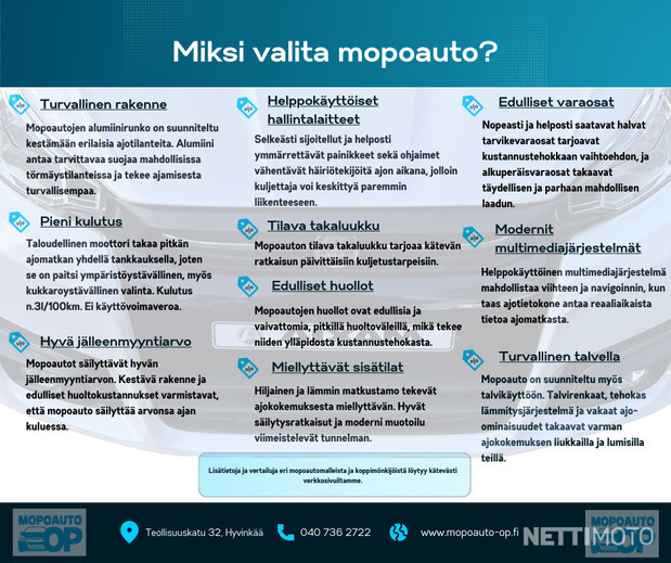 Saatavilla myös paljon lisävarusteita mm. lohkolämmitin, LED-valoja, korisarjoja, subwoofereita jne! Tutustu valikoimaan verkkosivuillamme www.mopoauto-op.fi