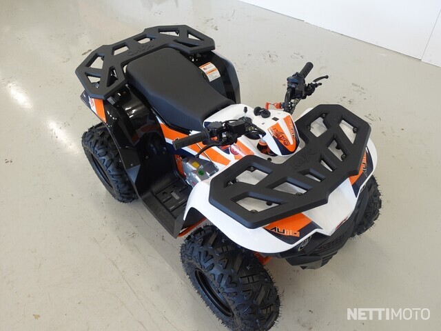 Kayo AU 110 mönkijä nuorille kuskeille ja lisäherkkuna tasot, joille voi sitoa vaikka repun kiinni metsäretkelle. Helppo hallita, eli puoliautomaattinen voimansiirto, jossa on yksi vaihde eteenpäin, vapaa ja pakki. Bensaa tankkiin, sähköstartilla käyntiin ja menoksi!