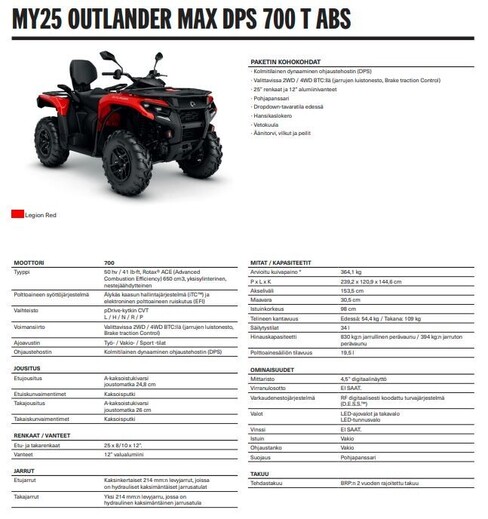 Kaksipaikkainen Outlander DPS 700 ABS tarjoaa mukavan ja turvallisen ajokokemuksen sekä kuljettajalle että matkustajalle. Yli 60kmh, ABS.