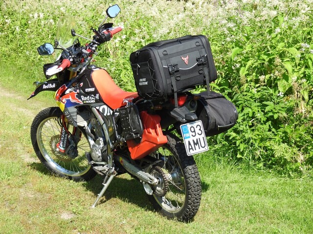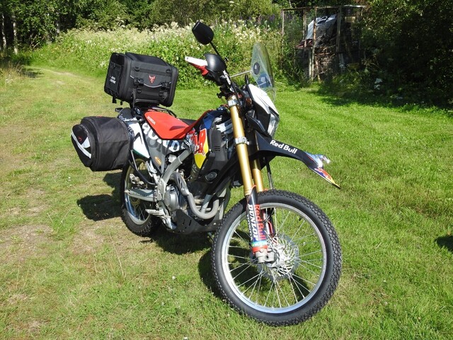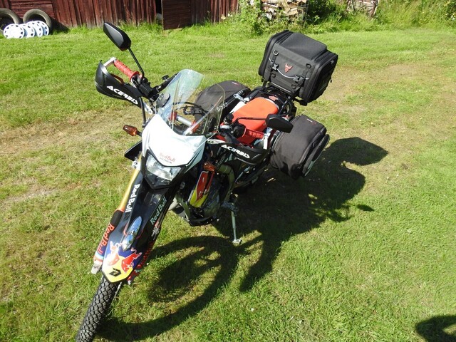 Upeassa kunnossa oleva seikkailupyörä,pärjää maastossa ja maanteillä.Pienen painon ansiosta (148 kg) helppo kiskoa irti hankalastakin paikasta yksin ilman apujoukkoja!!