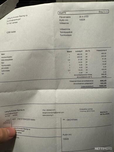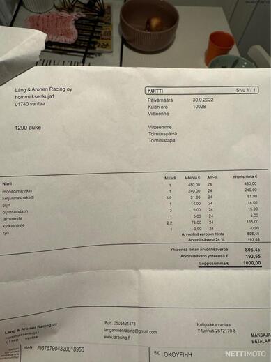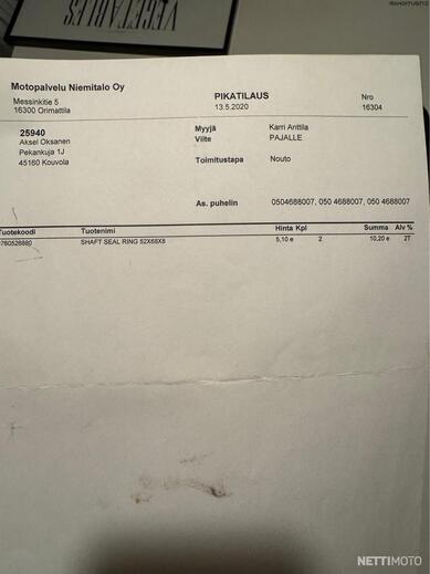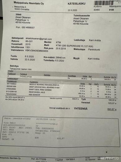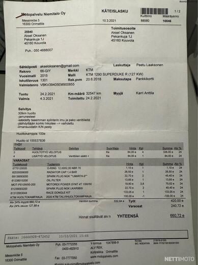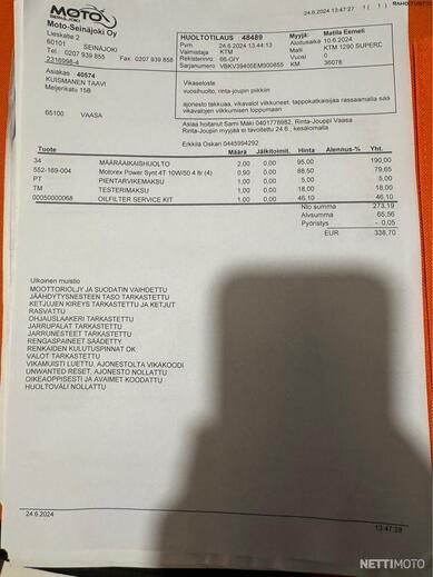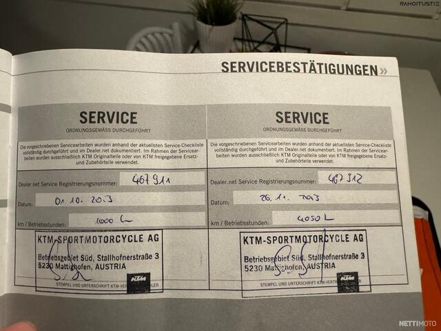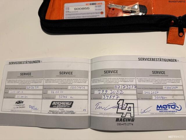 Löytyy alkuperäinen KTM huoltokirja sekä paljon kuitteja. Viimeisin huolto tehty Moto-Seinäjoki Oy:llä 06/2024. 36tkm kohdassa. Määräaikaishuolto kaikkine tarkastuksineen. -2022 huollossa uusittu ketjut ja rattaat. Venttiilit säädetty aiemmissa huolloissa ym..