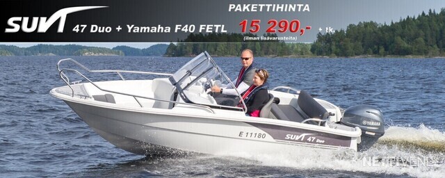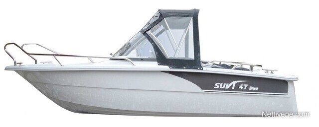 Suvi 47 Duo on monikäyttöinen ja edullinen tuplapulpettimalli, joka soveltuu niin yhteysvene-, mökki- kuin kalastuskäyttöönkin ja kulkee kevyenä mainiosti pienemmälläkin moottoriteholla. Kasvanut takasisätila on tuonut tarpeellista lisätilaa takapenkillä matkustaville. Veneen varustukseen kuuluu mm. kaiteet, tuulilasit, ja uimaportaat. Ohjauspulpettien alla reilut säilytystilat esim. kylmälaukulle tai kasseille. Pitkärikiselle moottorille. Sadevesityhjenevä. Lisävarusteena saatavana uusi kaksiosainen perähyttikuomu.
